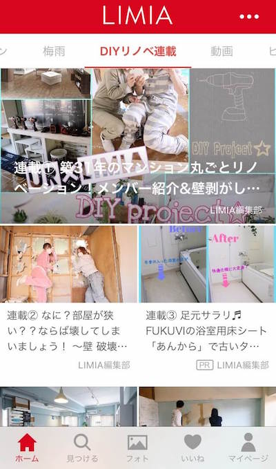 DIY住宅を扱うUR都市機構とLIMIAのコラボレーション企画「DIYリノベプロジェクト」が連載されています。何も手をつけていないマンションの一室から始まり、徐々にリノベーションをしていく様子が投稿されています。 メンバーがぶつかる問題やその時々の創意工夫などリアルな状況が伝わってきますので、これからDIYに取り組もうとしている方には特におすすめです!