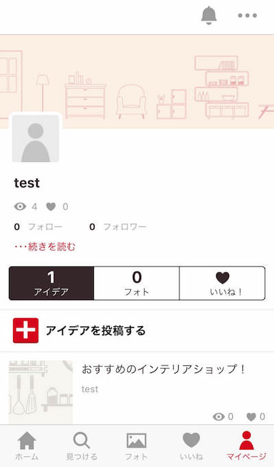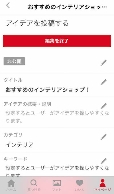 「マイページ」では、プロフィールの編集や自分が投稿したアイデアや画像の確認、アイデアの投稿などができます。 なお、マイページやいいねなどの機能はユーザー登録をしなければ利用できません。無料で登録できますので、ぜひ行いましょう。