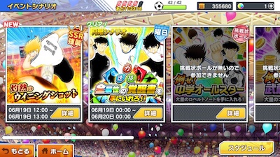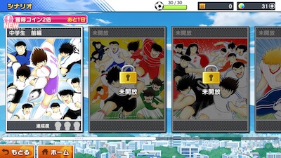 「シナリオ」は、キャプテン翼の世界を舞台に試合を行っていくモードです。通常の「シナリオ」、「イベントシナリオ」、「シェアプレイシナリオ」の3つのモードがあります。