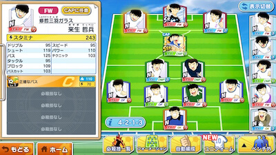 「チーム」では、フォーメーションを変更したり、チームのスキルを設定することができます。各選手には適正ポジションがあり、場合によっては能力が低下してしまうため、所有している選手の力を最大限生かせるように組みましょう。