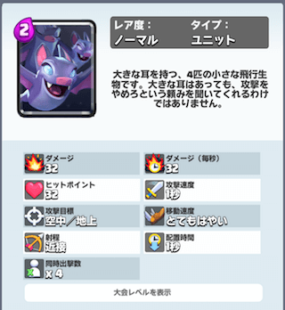 ダークネクロは最近下方修正が入りましたが、コウモリの強さを体験しているプレイヤーは多いかと思います。ただでさえやっかいな空ユニットで、スピードがめちゃめちゃ速いです。 コウモリの群れのカードではコスト2で4体のコウモリが出現するようです。HPが低いのでザップなど呪文での対処や「キッチン」で対処すると効率的に対処できそうですね。