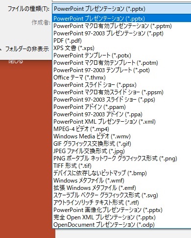 それでは、PowerPointで出力可能なファイルの拡張子について説明します。PowerPointで出力可能なファイルの拡張子の種類は「.pptx」・「.pptm」・「.ppt」・「.pdf」・「.xps」・「.potx」・「.potm」・「.pot」・「.thmx」・「.ppsx」・「.ppsm」・「.pps」・「.ppam」・「.ppa」・「.xml」・「.mp4」・「.wmv」・「.gif」・「.jpg」・「.png」・「.tif」・「.bmp」・「.wmf」・「.emf」・「.svg」・「.rtf」・「.odp」となります。