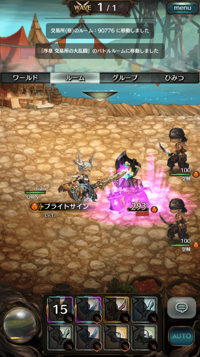 バトル画面はこのようになっています。早速倒してみましょう。 画面の下にはスキルスロットが8つあり、それぞれに自由にスキルをはめ込んで使うことができます。 スキルを一度使うとクールタイムが入り、その間は攻撃できません。 また、バトルは他のプレイヤーと共闘することもできるので、一人では倒せない敵に出会ったら他の仲間を呼んでみましょう!