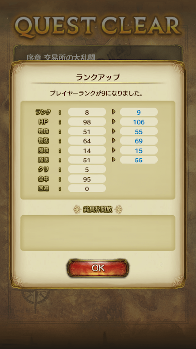 ランクが上がると自分の能力値が上昇します。 そして、ランクアップすることで武具枠が解放されたりするので、ガンガンクエストをやって、どんどんランクを上げましょう!