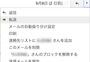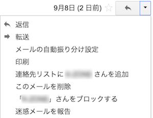 すると返信・転送などのメニューが出てきますが、その中の「○○」さんをブロックするを選択しましょう。