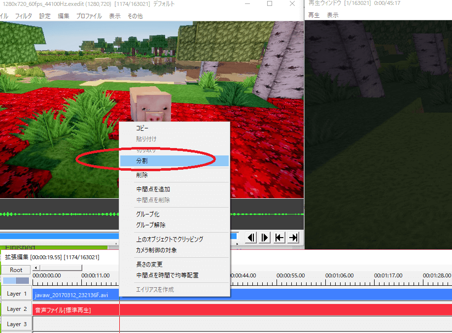 動画編集における一番の基礎は「カット」です。 動画の不要な部分を取り除き、動画の時間を短くすることができます。 やり方は、カットしたい時間にカーソルを持っていき、右クリック、そして「分割」をクリックします。