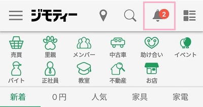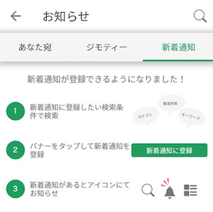 お知らせには自分宛ての連絡・ジモティーからの連絡・登録した検索条件にひっかかった投稿が表示されます。