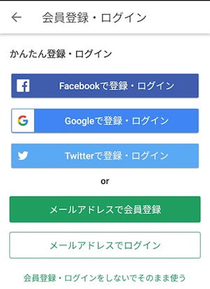 すでに会員登録してある場合は画面下部の「メールアドレスでログイン」をタップしてログインしましょう。 とりあえずアプリを触ってみてから利用するかどうか決めたいという人は、一番下の「会員登録・ログインをしないでそのまま使う」をタップすれば、ログインせずにメニューに行くことができます。