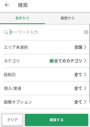 検索では、キーワードの他にも、対象エリア・カテゴリー・投稿日・個人or業者・画像が貼られている投稿かどうかなどの詳細指定が行えます。