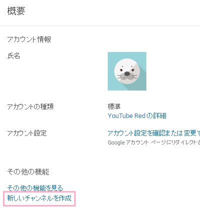 自分のアカウントの概要が表示されます。画面下部の「その他の機能」欄に「新しいチャンネルを作成」と書かれているので、そこをクリックしましょう。