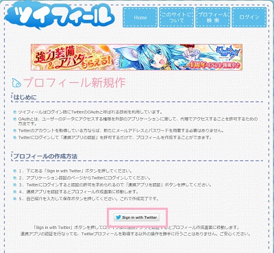 Twitterの認証が必要になるので、画面下部の「Sign in with Twitter」ボタンをクリックします。