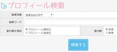 検索ページでは、パーソナル・好きなもの・苦手なもの・フリーの4つのタグからキーワード検索することで対象のタグを設定したユーザーを検索することができます。