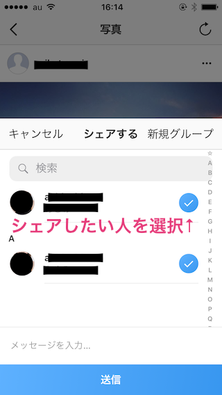 紙飛行機マーク(ダイレクトメッセージ)を選択すると、自分のフォロワーが出てきますので、その中から自分がダイレクトにシェアしたいフォロワーを選び、右側に表示されているシェアボタンを選択します。