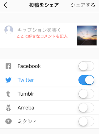 「シェアする」を選択すると、写真・動画をシェアしたいSNSを選択できるようになりますので、右のシェアボタンをタップしてシェアしたいSNSを選びましょう。タップをするとシェアボタンは色が変わり別ページに飛びます。