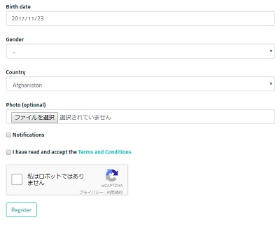全て入力が終わったら「私はロボットではありません」と書かれた文章の左にある枠をクリックしチェックを入れましょう。これは自動操作かどうか判断するための認証のようなものです。チェックが付いたら「Register」をクリックすれば登録が完了します。