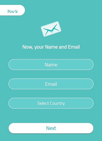 次の入力欄は上から順に「Name(名前)」「Email(メールアドレス)」「Select Country(在住している国)」となります。ここの名前は日本語も使用可能です。