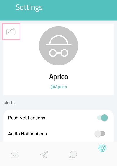 まずはSarahahのアプリを起動してください。起動したら、右下の歯車のアイコンをタップしてSettingsページを開きましょう。 Settingsページが表示されたら、画面左上にある四角に矢印のボタンをタップします。