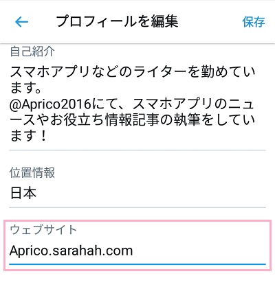 「プロフィールを編集」の中の「ウェブサイト」の入力欄に、先ほどコピーしたSarahahの自分のURLを貼り付けて、右上の「保存」をタップすれば完了です。
