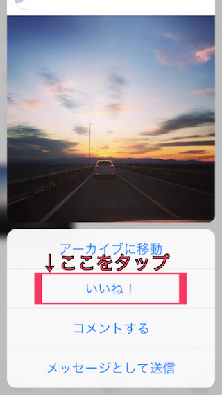 いくつかできる事の選択肢が表示されますので、今回は「いいね!」を選択し、タップしてみましょう。
