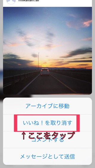長押ししたまま上にスライドをすると、いくつかできる事の選択肢が表示されますので、今回は「いいね!を取り消す」を選択し、タップしてみましょう。