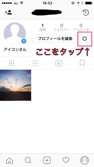 確認する方法は、まずプロフィール画面の設定のアイコンをタップします。