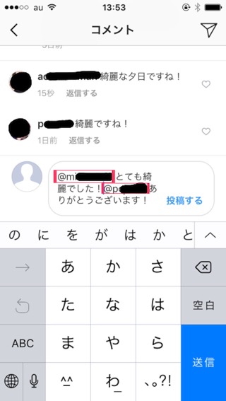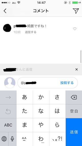 すると、画面のように「@名前」が表示されたコメントフォームが出てくるので、そのまま返信したいことを記入して「投稿する」を押せば返信は完了です!