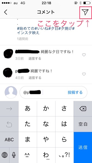 なんとこのマークをタップすると相手にダイレクトメッセージとして周りの人にみられずにメッセージを送ることができるのです。それではダイレクトメッセージでの返しかたをご紹介します。