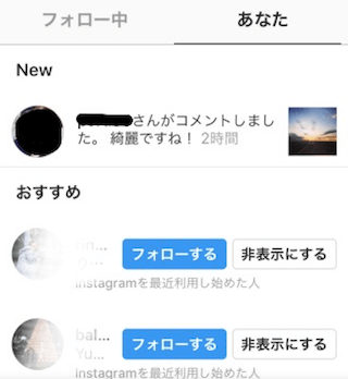 誰かが自分の写真にコメントをしてくれたり、いいねされたらここに通知がきます。