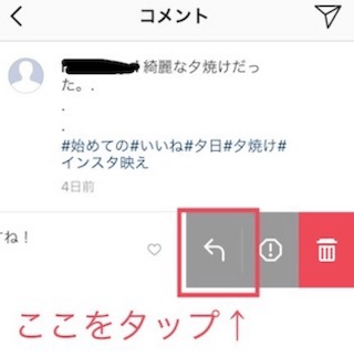 先ほどは「返信する」というコマンドをタップしましたが、今度は赤く囲んであるコメント自体を左に向かってスライドしてみてください。