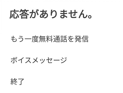 無料通話をかけても呼び出し画面が表示されたままで、一定時間かけつづけると「応答がありません」とシステムのほうで発信をキャンセルされます。