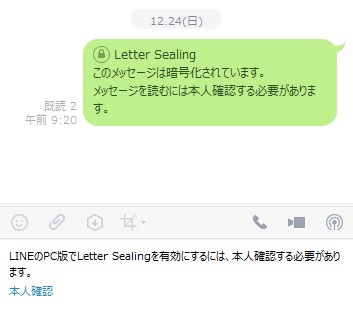 適当にトークルームを見てみると、「Letter Sealing このメッセージは暗号化されています。メッセージを読むには本人確認する必要があります。」と表示され、トーク履歴が見れなくなっているはずです。