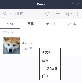 PC版からKeepにアップロードしたファイルをスマホアプリ版でダウンロードしてスマホに移したり、トークに貼り付けて共有するなんてことも可能です。