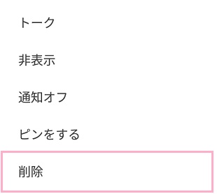 アカウントを削除してunknownになったユーザーとのトークルームを削除したい場合は、トーク一覧で対象のトークをタップしたままメニューを出し「削除」をタップします。