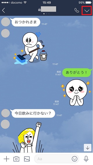 ①背景画像を変更したいトークルームを表示し、画面右上の「V」アイコンをタップします。