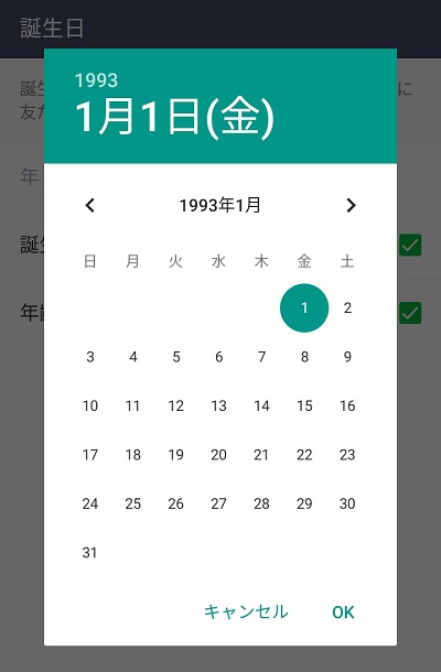 自分の生まれ年と月を選んだら、カレンダー内の日をタップしてOKを押せば誕生日の設定が完了します。