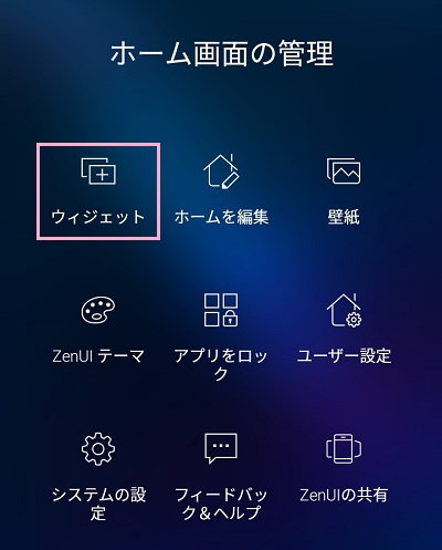ホーム画面の管理メニューが表示されたら、「ウィジェット」ボタンをタップしましょう。