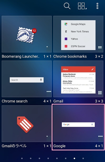 ウィジェット一覧が表示されるので、アプリのウィジェットの中から「Google」と書かれた検索バーを探しましょう。