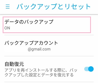 「データのバックアップ」をタップしてONにしましょう。これでデータが自動的にバックアップされるようになります。バックアップしたデータを適用する場合は、今使っているGoogleアカウントでログインすれば適用されます。