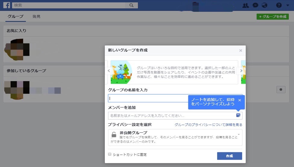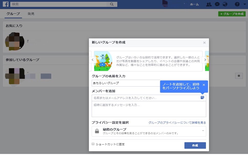 Facebookグループとは、特定の人たちとFacebook上で情報を共用したり、交流できる機能です。