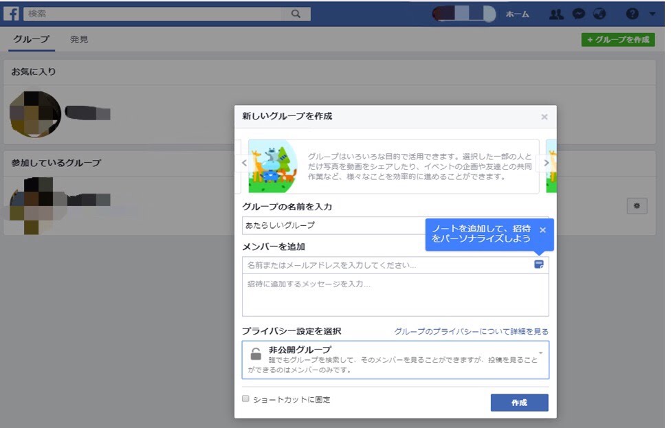 Facebook ページやタイムラインに比べてグループに参加した人だけのコミュニティができるのでより親密度の高い交流ができます。