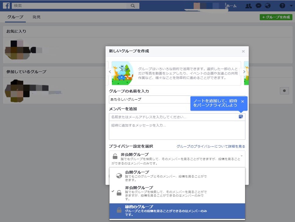 先ほどもお伝えしましたが、Facebookグループは参加するメンバーを選べるだけでなく公開範囲も設定することができます。