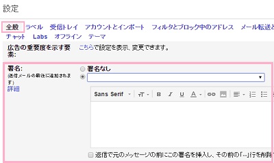 設定メニューが表示されたら、「全般」タブの下のほうへスクロールすると「署名」という入力フォームがあります。ここにシグネチャとして使う書名を設定することができます。