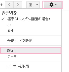 それでは、gmailのシグネチャを設定の仕方について説明します。まずはホーム画面右上の歯車アイコンをクリックして、メニューの「設定」を開きましょう。