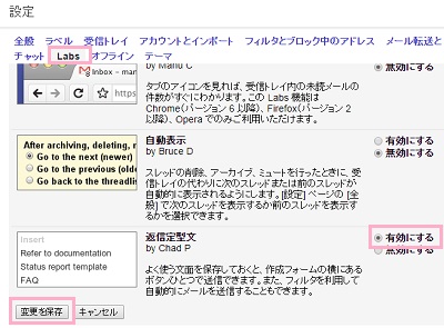 設定メニューの「Labs」タブにある「返信定型文」にある「有効にする」ボタンをクリックしてオンにし、「変更を保存」ボタンをクリックしましょう。