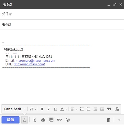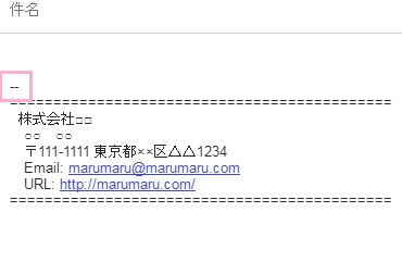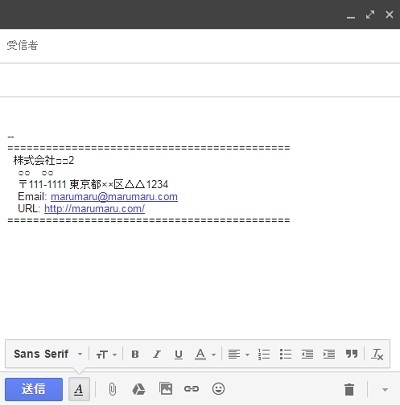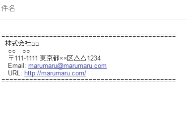 メールの作成時に、先ほど登録したシグネチャが挿入されるようになりました。これで毎回テンプレートをコピー&ペーストするといった手間は不要になります。