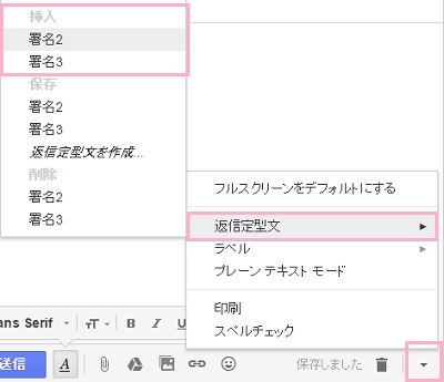 メールの作成時に署名を切り替える必要が出た時に、すでに挿入されている署名を消してから右下にある下矢印ボタンをクリックして、「返信定型文」の「挿入」メニューから必要な署名を選択してクリックします。