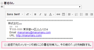 「全般」タブの「署名」の項目で、入力フォームの下に「返信で元のメッセージの前にこの署名を挿入し、その前の「--」行を削除する。」というチェックボックスがあるので、これをクリックしてオンにしましょう。