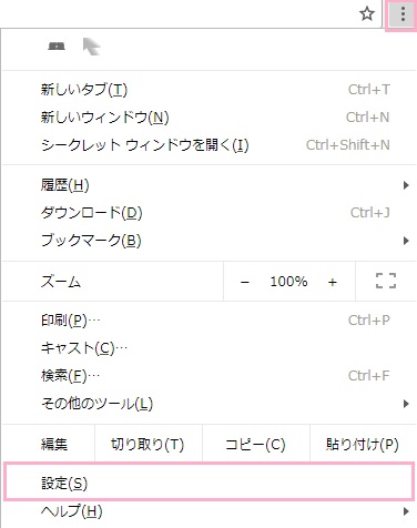 GoogleChromeを起動したら、画面右上にあるメニューボタンをクリックして、表示されたメニューの下のほうにある「設定」をクリックしましょう。