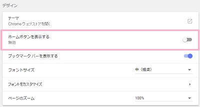 新しいタブで設定メニューが表示されます。「デザイン」一覧に「ホームボタンを表示する」の項目があるので、右にあるボタンをクリックしてオンにしましょう。
