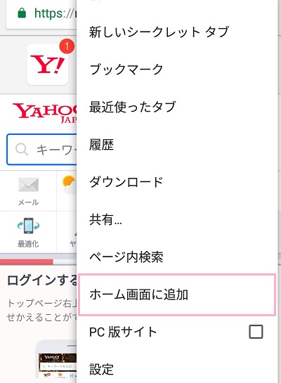 起動ページにしたいサイトにアクセスして、メニューから「ホーム画面に追加」をタップします。